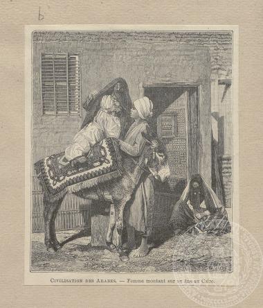 "Civilasation des Arabes - Femme montant sur un ane au Caire". Γυναίκα ανεβαίνει σε γάιδαρο, στο Κάιρο. Λιθογραφία.