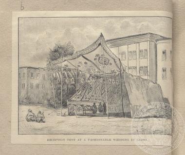"Reception tent at a fashionable wedding in Cairo". Σκηνή ως χώρος υποδοχής κοσμικού γάμου στο Κάιρο. Λιθογραφία του Max Rabes.