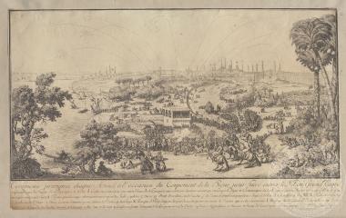 "Ceremonie pratiquée chaque Année a l'occasion du Coupement de la Digue pour faire entrer de Nil au Grand Cayre." Σκηνή από την ετήσια τελετή διάλυσης του αναχώματος/φράγματος για το πέρασμα του νερού του Νείλου στο Κάιρο.