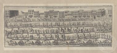 "La marche de la caravane du Grand Caire pour la Mecque". Πορεία καραβανιού από το Κάιρο προς τη Μέκκα. Λιθογραφία του Paul Lucas. 1719