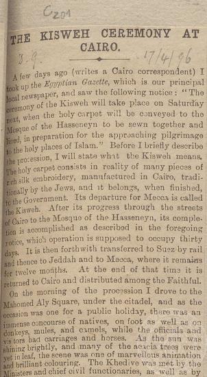 "The Kisweh ceremony at Cairo". Άρθρο σχετικά με την τελετή Kisweh στο Κάιρο. 17/04/1896.