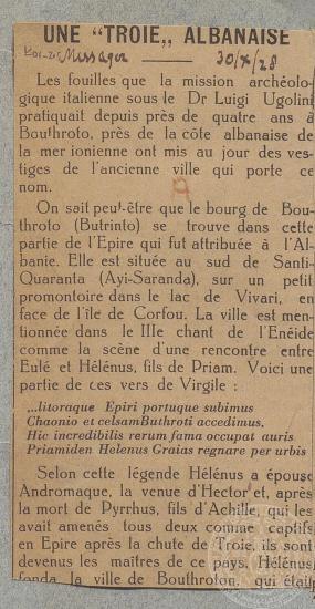 "Une "Troie" Albanaise" άρθρο της εφημερίδας "Le Messager d''Athènes" σχετικά με τις ανασκαφές της ιταλικής αρχαιολογικής αποστολής στο Βουθρωτό, 30/10/1928