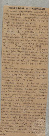 "Ανασκαφαί εις Αλβανίαν" άρθρο της εφημερίδας "Αγών των Παρισίων" σχετικά με τις ανασκαφές στο Βουθρωτό, 11/08/1928