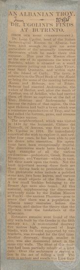 "An Albanian Troy. Dr. Ugolini's finds at Butrinto" άρθρο της εφημερίδας "Times" σχετικά με τις ανασκαφές της ιταλικής αρχαιολογικής αποστολής στο Βουθρωτό, 15/10/1928
