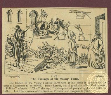 "The Triumph of he young Turks". Αναδημοσίευση γελοιογραφίας τηε εφημερίδας "Il Papagallo". XX/04/1909