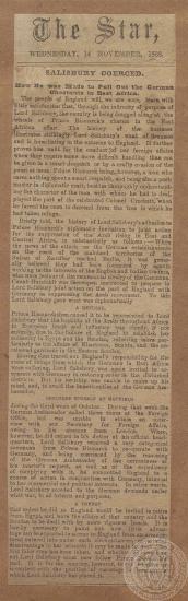 "Salisbury coerced: How he was made to pull out the German chestnuts inn East Africa", εφημερίδα "The Star", 14/11/1888