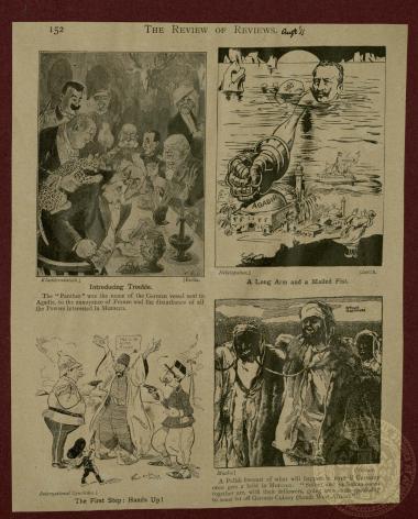 "The Revie of Reviews". Αναδημοσίευση τεσσάρων γελοιογραφιών από τα περιοδικά "Kladderadatch", "Nebelspalter", "Intenrational Syndicate", και "Mucha". XX/08/1911