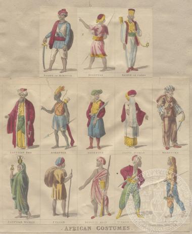 "African Costumes". Έγχρωμες ανδρικές και γυναικείες χαρακτικές φιγούρες με ενδυμασίες της Αφρικής.