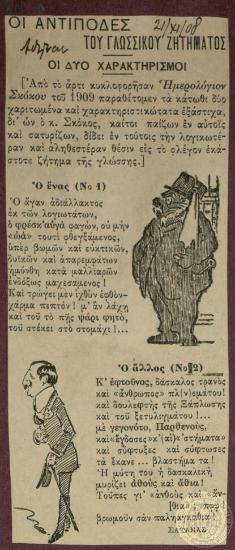 "Οι Αντίποδες του Γλωσσικού Ζητήματος". Γελοιογραφία και σχόλιο της εφημερίδας "Αθήναι". 21/11/1908