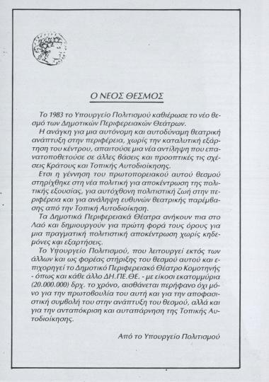 Ως θεσμός, το ΔΗ.ΠΕ.ΘΕ. Κομοτηνής ιδρύθηκε το Νοέμβριο του 1984 ως Νομικό Πρόσωπο Δημοσίου Δικαίου (Ν.Π.Δ.Δ.) του Δήμου Κομοτηνής βάση προγραμματικής σύμβασης μεταξύ του Υπουργείου Πολιτισμού - Δήμου Κομοτηνής και ΔΗ.ΠΕ.ΘΕ επί Δημαρχίας Χαράλαμπου Κατσιμίγα. Το 1992 το ΔΗ.ΠΕ.ΘΕ. αλλάζει το θεσμικό του πλαίσιο και μετατρέπεται σε Δημοτική Επιχείρηση (Ν.Π.Ι.Δ.) επί Δημαρχίας Γεώργιου Παπαδριέλλη. Η φιλοσοφία των ΔΗ.ΠΕ.ΘΕ. είναι, το θέατρο να προσεγγίσει το κοινό και να αναδείξει το καλλιτεχνικό δυναμικό της περιφέρειας.