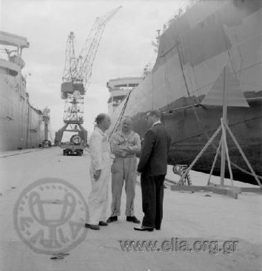 Ο Σταύρος Νιάρχος (στο κέντρο) και ο τότε πρέσβυς των Ηνωμένων Πολιτειών στην Ελλάδα Ellis Briggs, κατά την επίσκεψη του δεύτερου στα "Ελληνικά Ναυπηγεία" του Σκαραμαγκά.