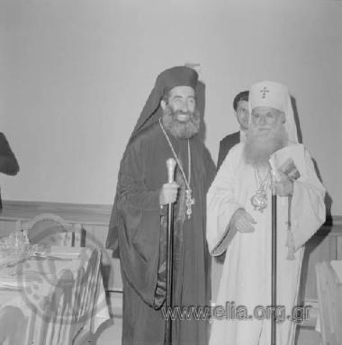 Visit of the Patriarch of Russia and Romania to the Penteli Monastery. Stylianos Pattakos next to an image of the Secret School..