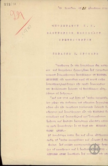 Telegram from Sergakis and Magonis to the Prime Minister, concerning Kalomenopoulos" resignation and the appointment of another.
