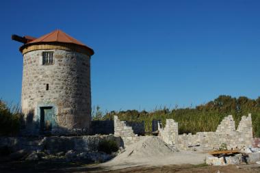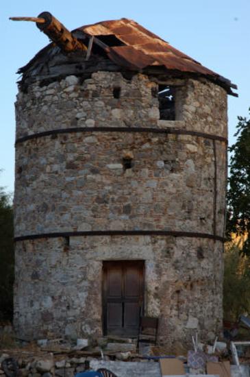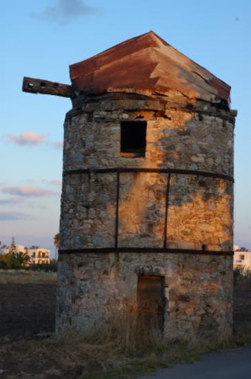 Ανεμόμυλος με πανιά στην Κω και συντροφιά με ποδήλατα μπροστά του.