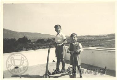 Οι μικροί Μαρίνος και Γιώργος Ι. Γερουλάνος σε βεράντα με πατίνι.
