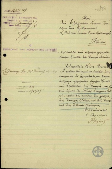 Επιστολή του Προέδρου της Κοινότητας Ιστιαίας προς τον Ε. Βενιζέλο "περί υποβολής εννέα αντιγράφων ψηφισμάτων διαφόρων Κονοτήτων της Επαρχίας Ιστιαίας".
