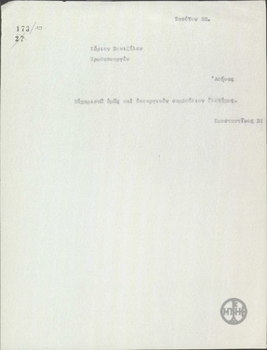 Ευχαριστήριο τηλεγράφημα του Βασιλιά Κωνσταντίνου.