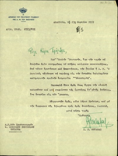 Επιστολή του αρχηγού του Πολιτικού Γραφείου του βασιλιά Παύλου, Α.Σ. Μεταξά, προς τον Σ. Βενιζέλο με την οποία του αποστέλλει το κείμενο της συνέντευξης του βασιλιά προς την εφημερίδα "Ελευθερία" ζητώντας του να του γνωστοποιήσει τις απόψεις του επί του περιεχομένου της προκειμένου να τις αναφέρει στον βασιλιά.