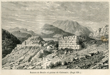 Τα ερείπια της αρχαίας Δαυλίδας με την πεδιάδα της Χαιρώνειας στο βάθος.