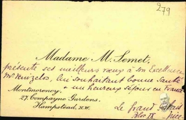 Συγχαρητήριο τηλεγράφημα της M. de Reineck προς τον Ε.Βενιζέλο για την εκλογική του επιτυχία.