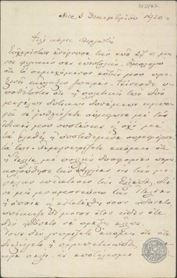 Επιστολή προς τον Ε.Βενιζέλο σχετικά με το θάνατο του καθηγητή Angelo Pizzorno.