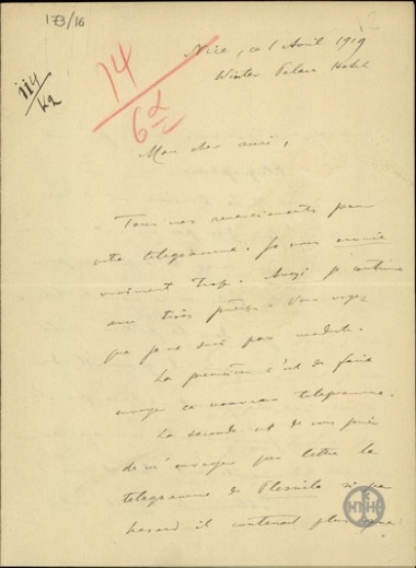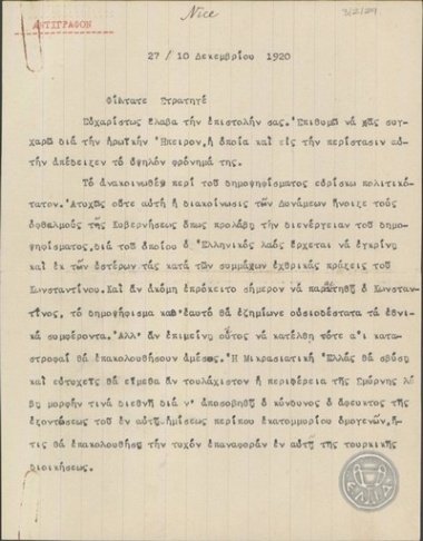 Επιστολή του T.Ionescu προς τον Ε.Βενιζέλο σχετικά με τις διαπραγματεύσεις για την ειρήνη.
