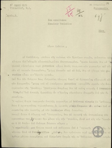 Σχέδιο επιστολής του Κ.Π. Τσολαϊνού προς τον [Eric Ince] σχετικά με την άρνηση του Ελευθερίου Βενιζέλου να δεχτεί έμμισθη θέση στη Federation of Leagues of Nations Societies.