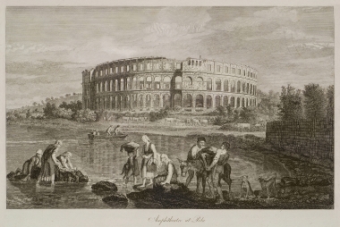 Το Ρωμαϊκό Αμφιθέατρο της Πόλα (Pula) από τα δυτικά. Σλοβένες γυναίκες πλένουν τα ρούχα τους στη θάλασσα. Κάτοικοι της πόλης προσέρχονται για να φορτώσουν νερό ή να ποτίσουν τα ζώα τους σε πηγή που βρίσκεται κοντά στο ρωμαϊκό αμφιθέατρο.