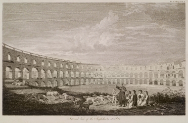 Εσωτερική άποψη του Ρωμαϊκού Αμφιθεάτρου της Πόλα (Pula). Επιδημία έχει πλήξει τα ερίφια της περιοχής με αποτέλεσμα να απαγορευτεί με διάταγμα η κατανάλωση αρνίσιου κρέατος. Σλαβόφωνοι βοσκοί έχουν καταφύγει στο εσωτερικό του αμφιθεάτρου με τα κοπάδια τους. Ένας μοναχός του Αγίου Αντωνίου ευλογεί και ραντίζει τα πρόβατα με αγίασμα, με αποτέλεσμα το κοπάδι να τρομάξει και τα σκυλιά να αρχίσουν να γαβγίζουν στον μοναχό. Στα δεξιά της εικόνας διακρίνονται όπλα, τα οποία σύμφωνα με τον συγγραφέα φέρουν κατά παράδοση πάντα μαζί τους οι Σλαβόφωνοι κάτοικοι.