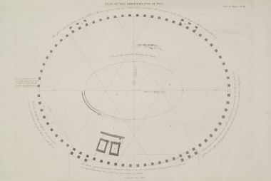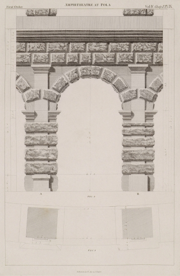 Το Ρωμαϊκό Αμφιθέατρο της Πόλα (Pula): Κάτοψη πεσσών και όψη της τοξοστοιχίας του πρώτου ορόφου.