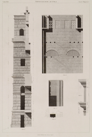 Το Ρωμαϊκό Αμφιθέατρο της Πόλα (Pula): Εικ. 1. Τομή εξωτερικού τοίχου. Εικ. 2. Κατά μήκος τομή του άνω τμήματος πλευρικού πύργου-αντηρίδας, όπου διακρίνονται ίχνη του κλιμακοστασίου. Εικ. 3. Εξωτερικά γείσα της κορυφής του πλευρικού πύργου-αντηρίδας . Εικ. 4 και 5. Σχέδιο και τομή του τοίχου που κύκλωνε την κονίστρα, σχηματίζοντας την εξέδρα.