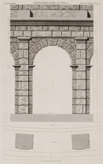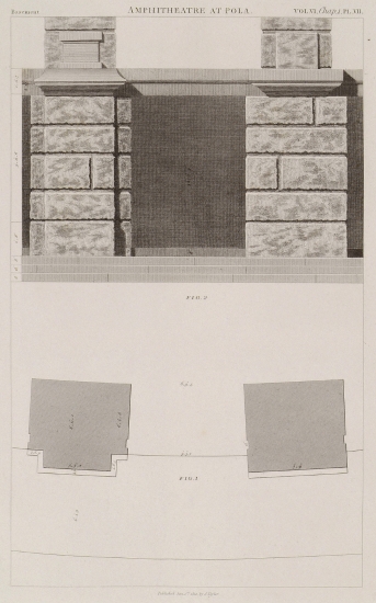 Το Ρωμαϊκό Αμφιθέατρο της Πόλα (Pula): Εικ. 1. Αναπαράσταση της δυτικής όψης. Εικ. 2. Εγκάρσια τομή.