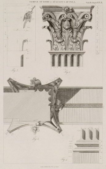 Ναός της Ρώμης και του Αύγουστου στην Πούλα (Pula) στην Κροατία (γωνιαίο τμήμα): Εικ. 1. Πλάγια όψη. Εικ. 2. Κρηπίδα, στυλοβάτης και βάση κίονα. Εικ. 3. Όψη κιονόκρανου και θριγκού. Εικ. 4. Άνοψη κίονα και φατνωμάτων.