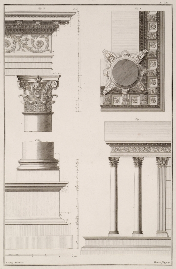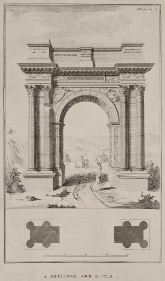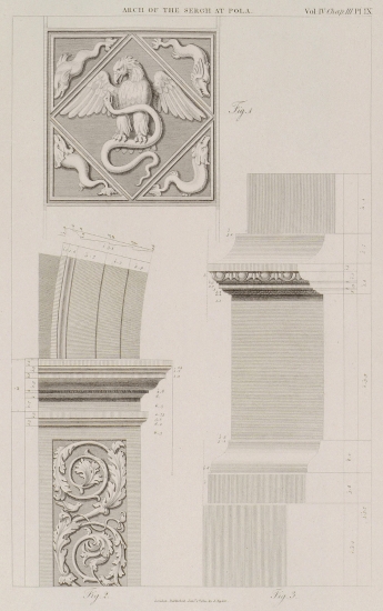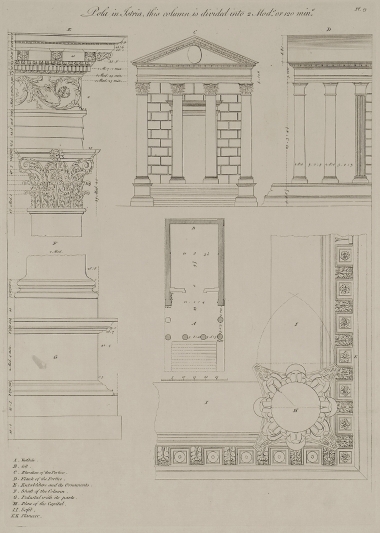 Αρχιτεκτονικά σχέδια του Ναού της Ρώμης και του Αυγούστου στην Πούλα της Κροατίας: A. Κάτοψη του προνάου. Β. Κάτοψη του σηκού. C. Πρόσοψη. D. Πλάγια όψη του προνάου. E. Τμήμα όψης γωνιακού θριγκού και κιονοκράνου. F. Βάση κίονα. G. Τμήμα γωνιακού στυλοβάτη. Η. Άνοψη κίονα. Ι. Άνοψη επιστυλίων. Κ. Άνοψη γείσου.