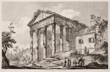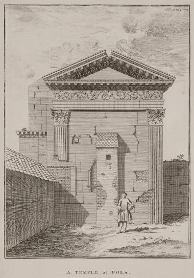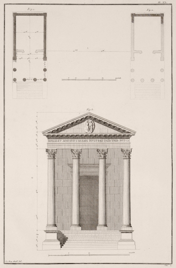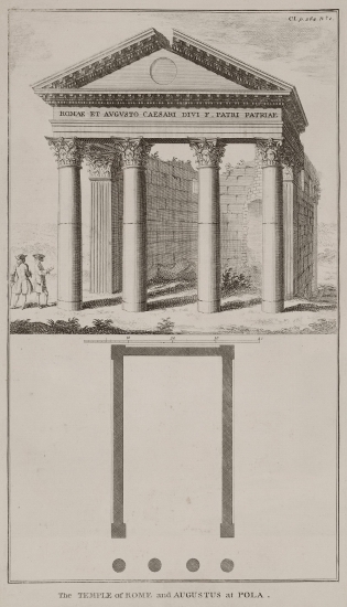 Κατόψεις του ναού της Ρώμης και του Αύγουστου στην Πούλα (Pula) στην Κροατία, καθώς και όψη της εισόδου του.