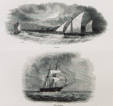 Εικ. 1. Άποψη της Πούλας στην Κροατία. Εικ. 2. Το πλοίο "Ίρις", με το οποίο οποίο ταξίδεψε ο συγγραφέας από τη Μάλτα ως τον κόλπο της Τεργέστης.