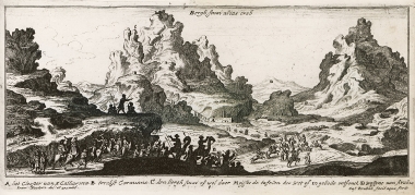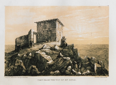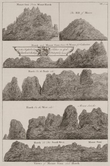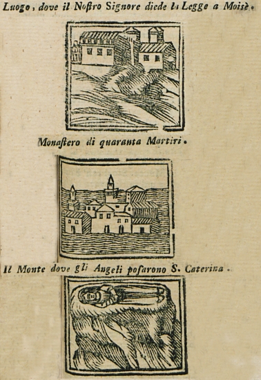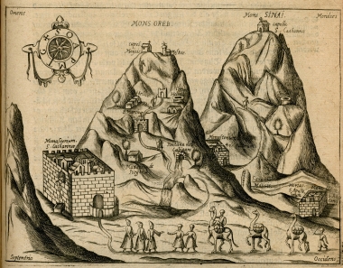Το όρος Σινά, με τη μονή της Αγίας Αικατερίνης (Α). Το Όρος του Μωυσή (D). Στο πρώτο επίπεδο, οθωμανικό καραβάνι προσκυνητών στη Μέκκα.