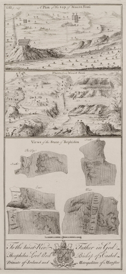 Χάρτης της κορυφής του όρους Σινά. Χάρτης της περιοχής γύρω από την κορυφή του όρους Σινά. Απόψεις του επονομαζόμενου Βράχου του Ρεφιντίμ, σταθμού στην Έξοδο των Εβραίων σύμφωνα με τη Βίβλο.