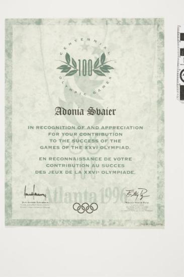 Δίπλωμα συμμετοχής που απονεμήθηκε στην Αντωνία Σβάιερ κατά την διάρκεια των Ολυμπιακών Αγώνων Ατλάντα 1996