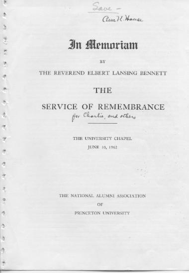 Scrapbook memorial service of rememberance of Princeton University (p. 1) for Charles Lucius House, 21 , June 10, 1962