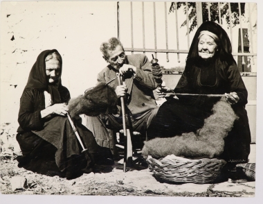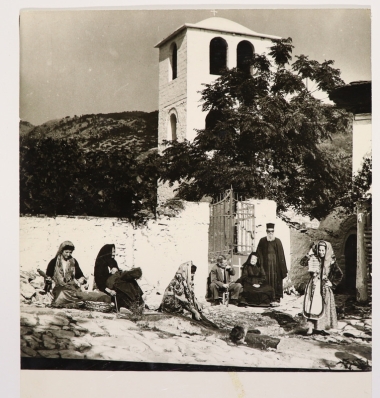 Snapshot of daily life outside the Holy Church of St. Dimitriou Theologu Thassos, 1961