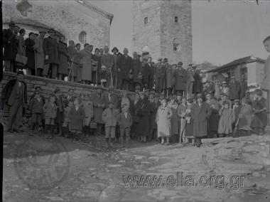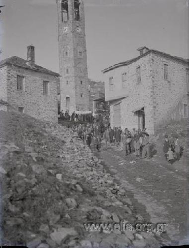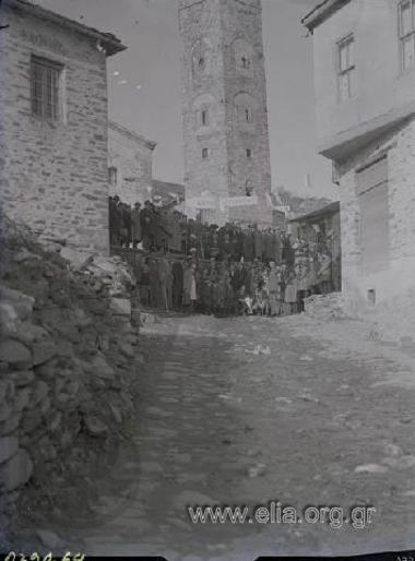 Το γκρούπ των εκδρομέων αναχωρεί. Στο βάθος το καμπαναριό του Αγ. Νικολάου.