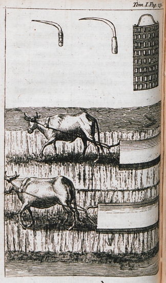 Αγροτικά εργαλεία για τον θερισμό. Αλώνισμα με μηχανισμό τον οποίο σέρνουν βόδια, στην Ανατολική Θράκη, πιθανώς στην περιοχή του Λουλέ Μπουργκάζ.