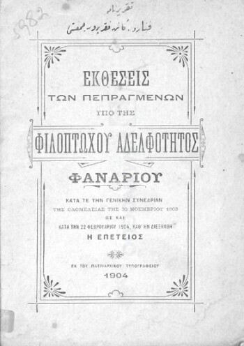 Έκθεσις των πεπραγμένων υπό της Φιλοπτώχου Αδελφότητος Φαναρίου κατά τε την Γενικήν Συνεδρίαν της ολομελείας της 30 Νοεμβρίου 1903 ως και κατά την 22 Φεβρουαρίου 1904, καθ' ην διεξήχθη η επέτειος