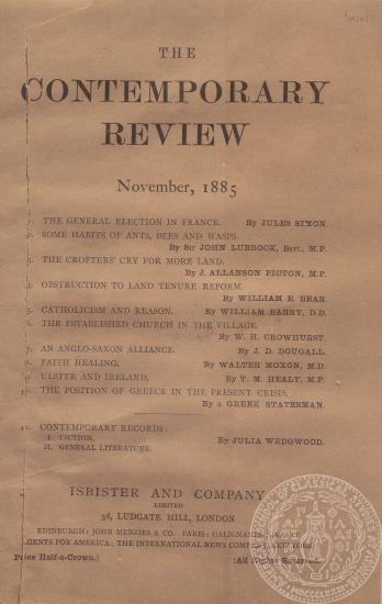 "Position of Greece in the present crisis", "The Contemporary Review", 11/1885