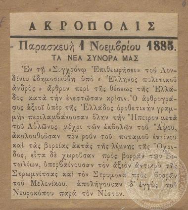"Τα σύνορά μας", "Ακρόπολις", 1/11/1885