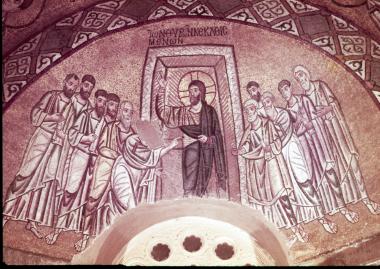 Σχέδιον της κεντρικής κόγχης του Ιερού Βήματος του καθολικού με τον θολωτόν διάδρομον υπό το σύνθρονον, εντός του οποίου ανευρέθη πλήθος ψηφίδων. Δεξιά υπόγειος κρύπτη υπό το δάπεδον του διακονικού.