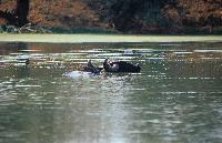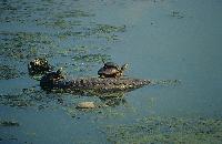 Νεροχελώνες λιάζονται πάνω σε λάστιχο αυτοκινήτου που επιπλέει στον ποταμό Γαλλικό