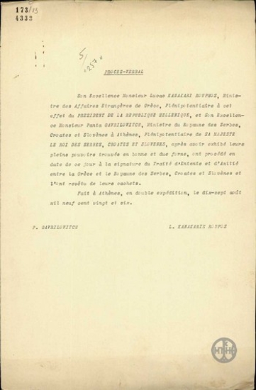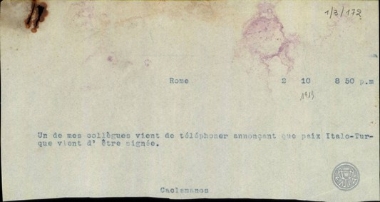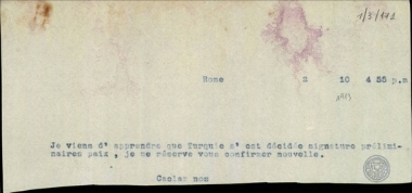 Τηλεγράφημα του Ευ. Αβέρωφ με το οποίο ανακοινώνει τηλεγράφημα του Γ. Καρτάλη σχετικά με τη θέση του υπέρ της απόσυρσης της Ελλάδας από την υποψηφιότητά της ως μη μόνιμου μέλους του Συμβουλίου Ασφαλείας του ΟΗΕ.