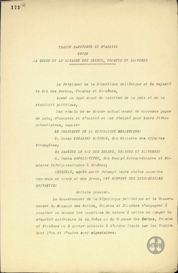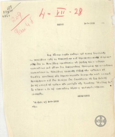 Επιστολή του Υπουργείου Εξωτερικών προς τα Υπουργεία Εσωτερικών, Οικονομικών, Δικαιοσύνης, Παιδείας, Γεωργίας, Εθνικής Οικονομίας, Προνοίας, Συγκοινωνίας, Υγιεινής, Αεροπορίας και στο Πολιτικό Γραφείο του Πρωθυπουργού, στο Γενικό Επιτελείο Στρατού και Γενικό Επιτελείο Ναυτικού που διαβιβάζει συνοπτικά δελτία της δράσης της Κοινωνίας των Εθνών κατά τους μήνες Φεβρουάριο και Μάρτιο.